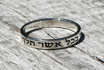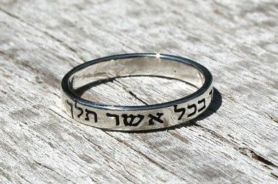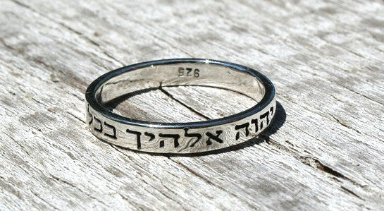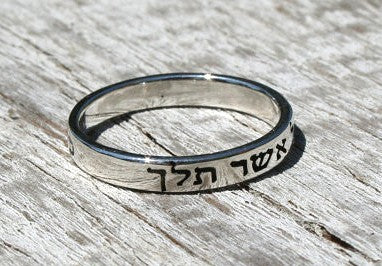 Joshua 1:9 For the Lord Your God is With You Hebrew Bible Verse Ring is a beautiful and meaningful accessory that can be worn as a symbol of faith or as a thoughtful gift for someone special. The ring is made from high-quality sterling silver and features כי עמך יהוה אלהיך בכל אשר תלך inscribed on the outside. This solid sterling silver ring is 1.2mm thick and 3.5mm wide, offering a perfect balance of durability and elegance. Choose this meaningful accessory for yourself or as a heartfelt gift.